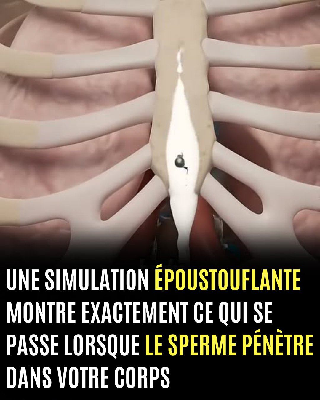 À l’aide d’un modèle anatomique sans peau, la simulation montre un liquide blanc représentant le sperme qui est consommé avant de suivre son chemin dans la gorge et dans le système digestif. De petites formes représentant les spermatozoïdes se déplacent avec le liquide, tandis que le clip guide les spectateurs à travers le processus biologique étape par étape.
